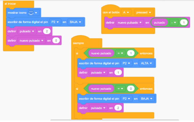 Si pulsamos el botón A el led se queda encendido aunque dejemos de pulsarlo y al pulsar de nuevo el botón A el led se apagará.